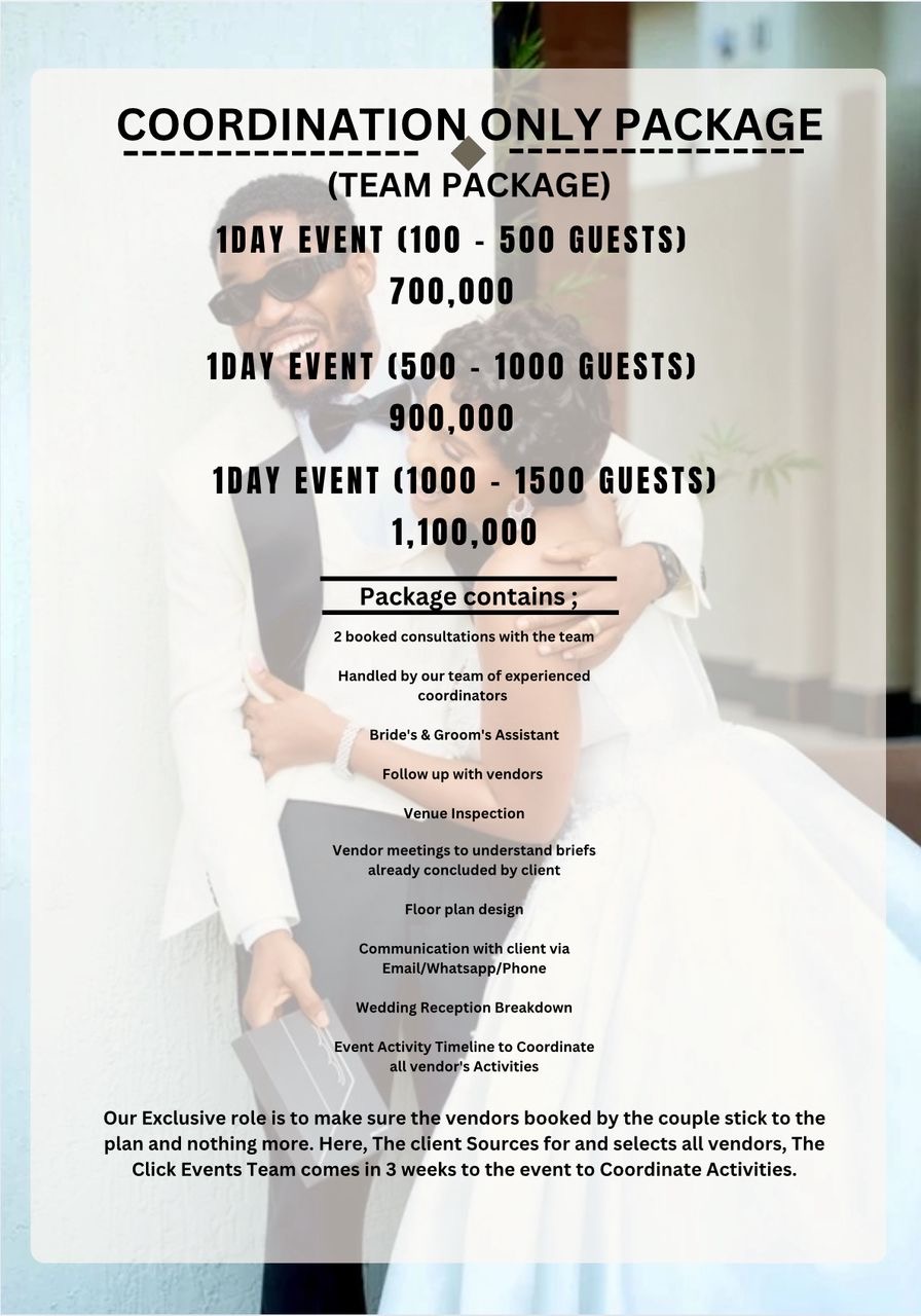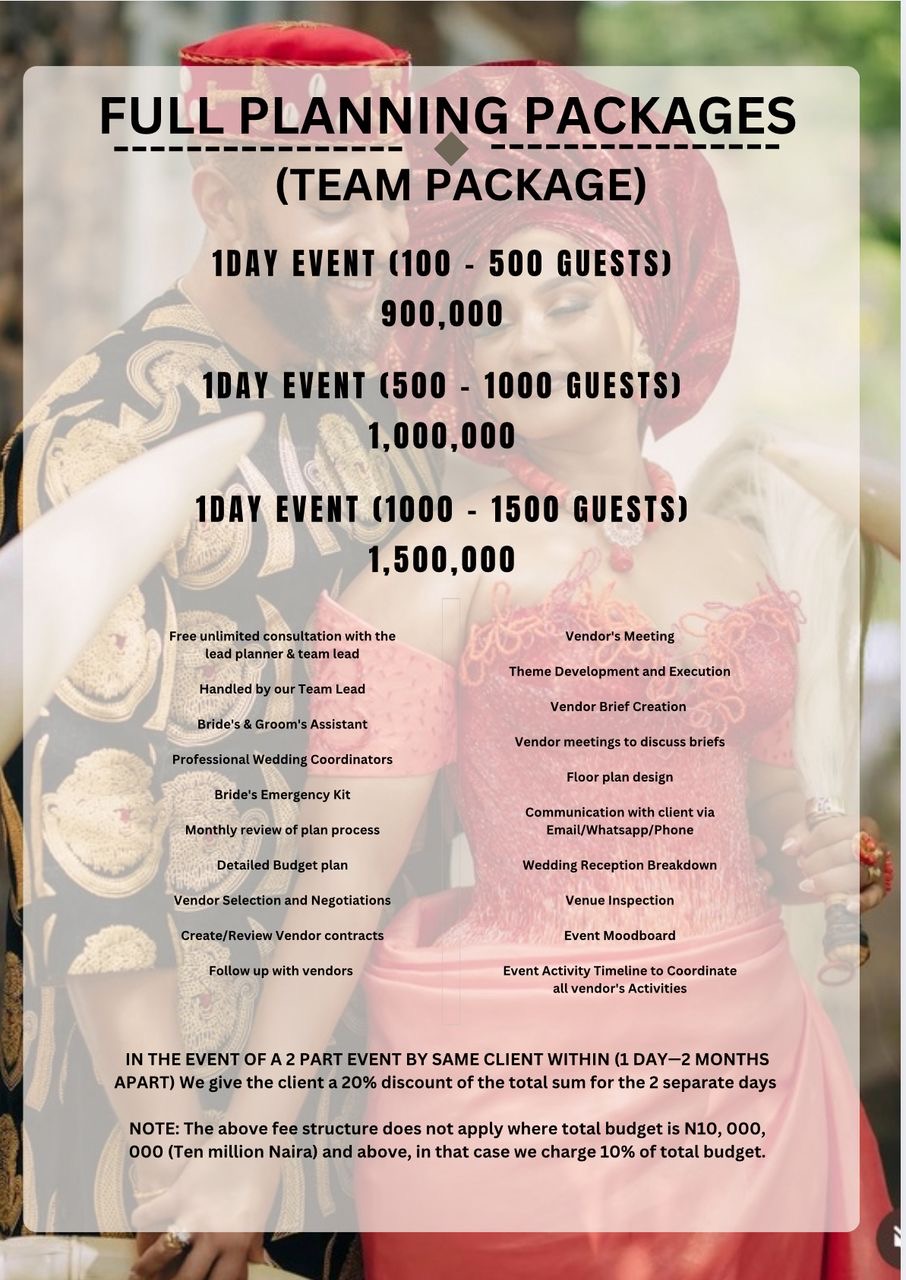 Discover our comprehensive pricing packages designed to make your dream wedding affordable and unforgettable, with transparent costs for every aspect of event planning.